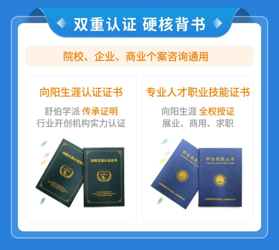 考核合格配套两个证书:一个行业标准舒伯学派-向阳生涯认证证书;一个相关部门的《专业人才职业技能证书》
